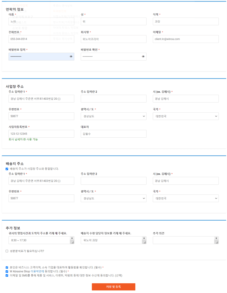 이후, 아래와 같이 회원가입에 필요한 모든 정보를 입력한 후에 저장 및 등록 버튼을 클릭합니다.